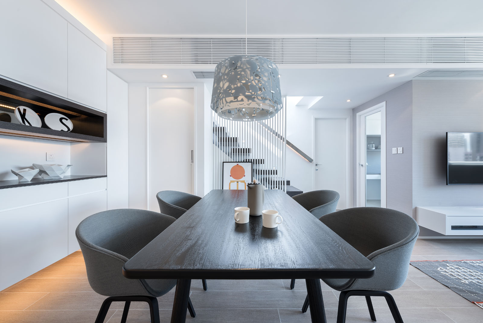The stair and windows let in the nature light into this white unit to make it warmer and brighter. The original design of stair is changed so as to enlarge the activity space in living room. To achieve a visually cohesive interior, the same design was used for all the cabinets, to match the light brown flooring with wooden patterns. This gives the interior a natural and minimalist look.