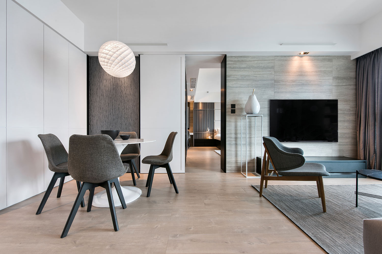 This is a sweet home for a pair of young couple. The design aims to provide a spacious home that is stylish and minimalist. Therefore, we used glass, tiles with marble texture, and white & gray color in order to create a unique and cozy house.