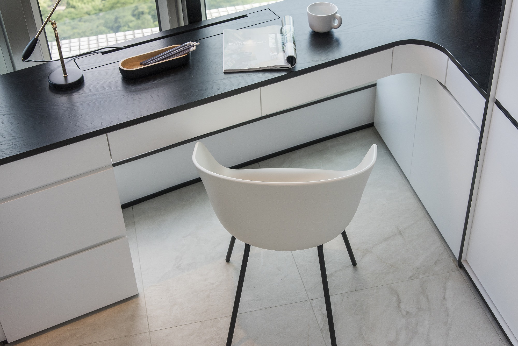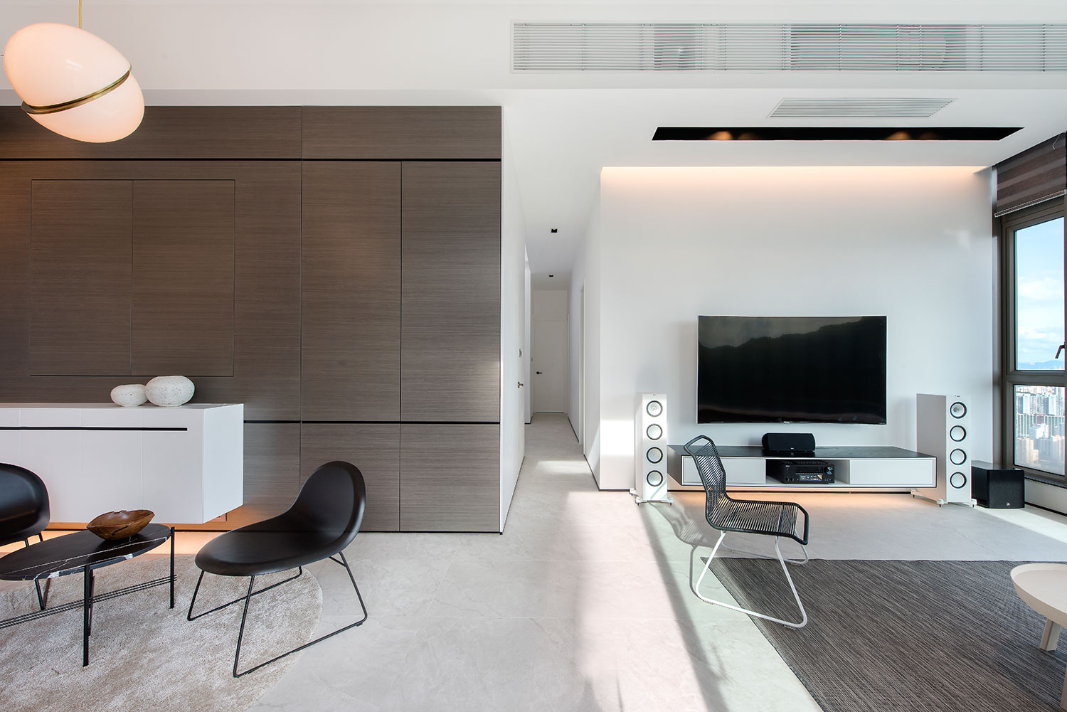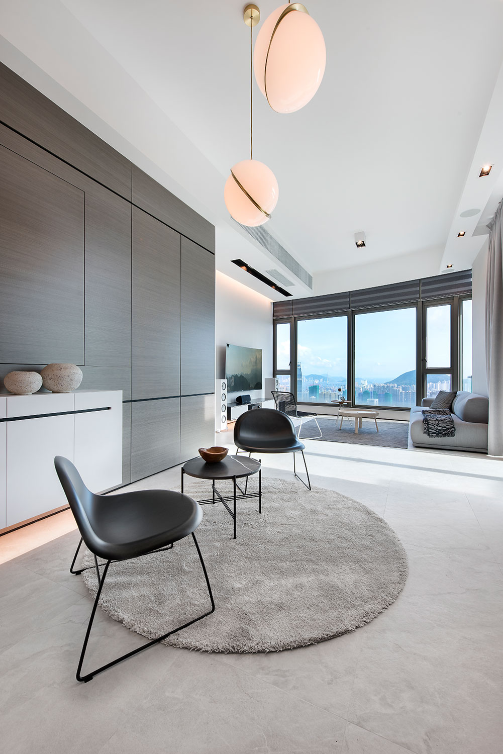 顏色以白及灰色為主並形成對比,配合原本的特大窗戶設計,簡單的顏色配搭令空間變得更加明亮耀眼。而細膩的極幼黑色線條亦連貫全屋空間, 強調簡約獨特的設計概念。