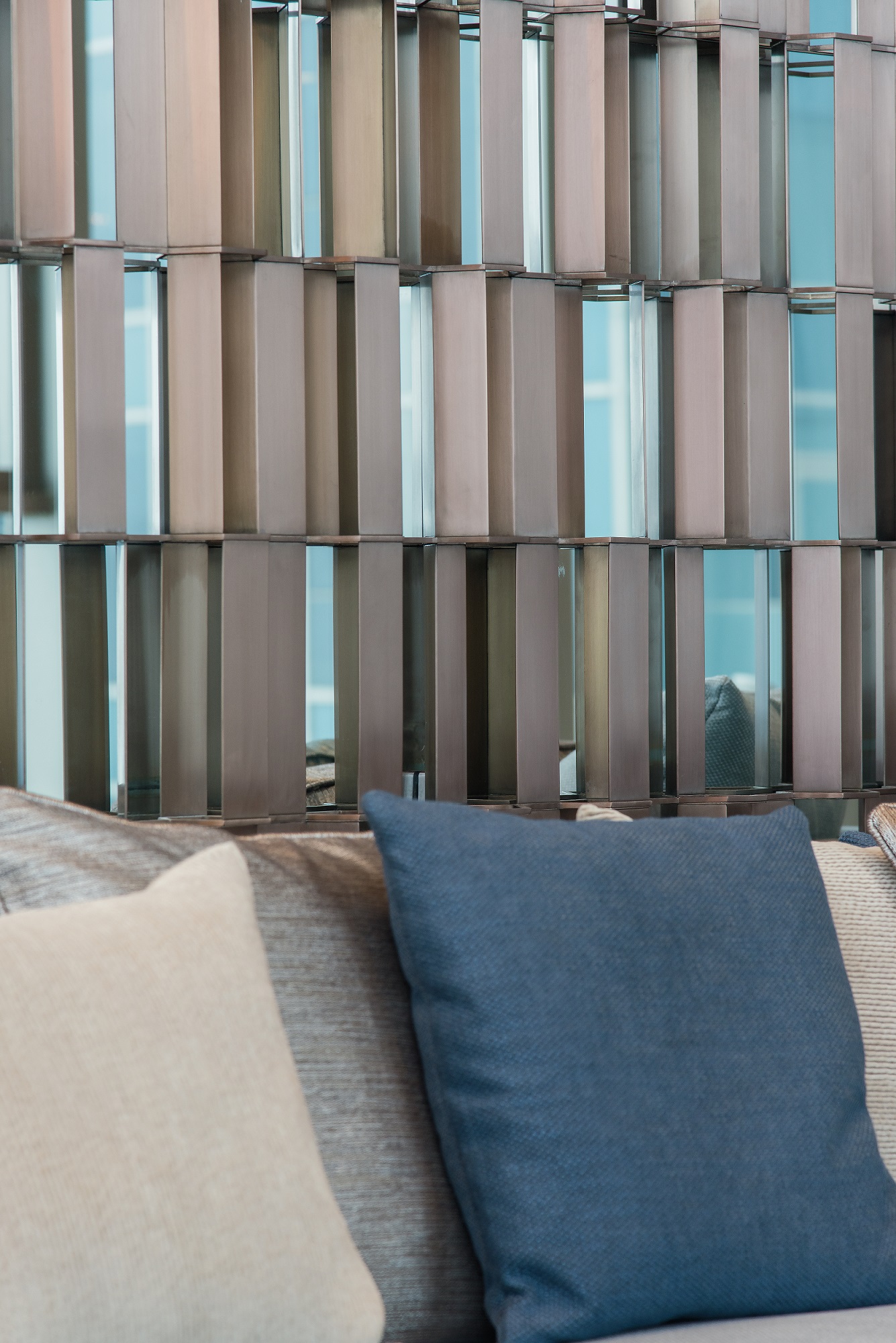 To embraces its scenic surroundings, using rich materials palettes such as wood, marble, leather, and metal, with different shades of color to express the distinct features of the location yet create a gorgeous modern environment. A custom-made rose-gold panel across the floor-to-ceiling with the reflection of over-endless acres of mountain view creating a spacious feeling of low-profile luxury in the living room. Yet, a leather-covered staircase and the rose-gold frame in the bedroom further extend the elegant ambiance.