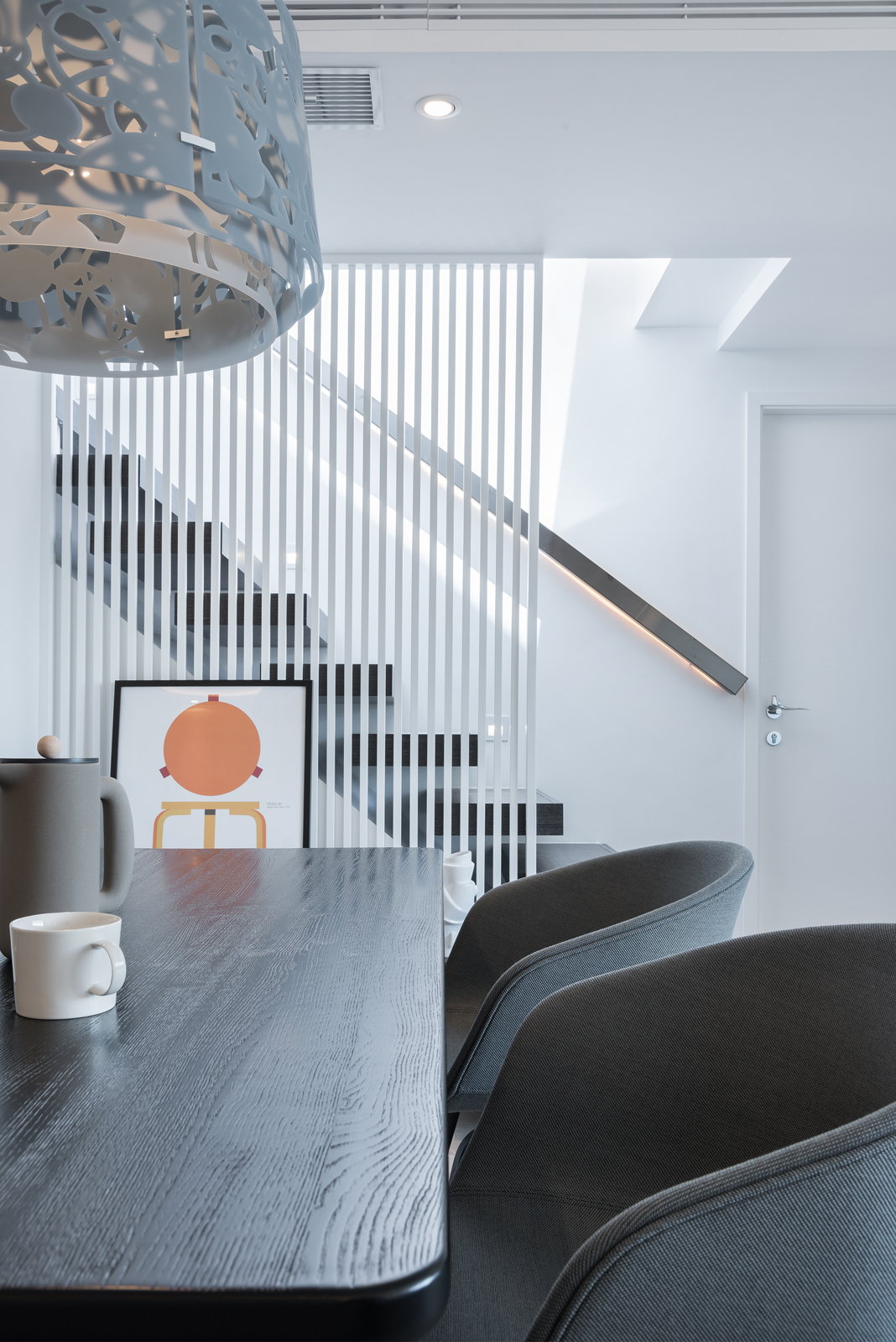 The stair and windows let in the nature light into this white unit to make it warmer and brighter. The original design of stair is changed so as to enlarge the activity space in living room. To achieve a visually cohesive interior, the same design was used for all the cabinets, to match the light brown flooring with wooden patterns. This gives the interior a natural and minimalist look.