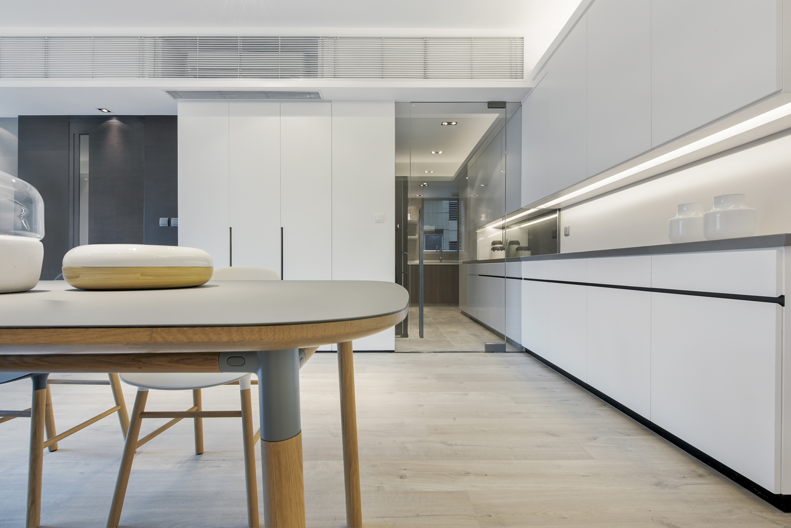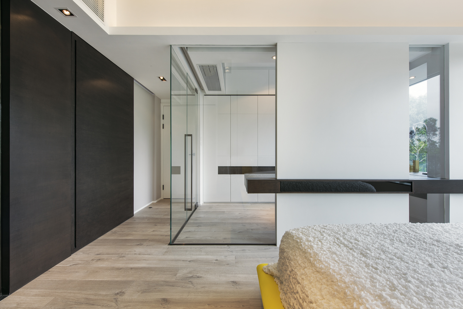 The apartment combines a modern and minimal appeal meant for practical use. The key to connecting the bedroom and the working area is floor-to-ceiling glass that allows more closeness between the family members.