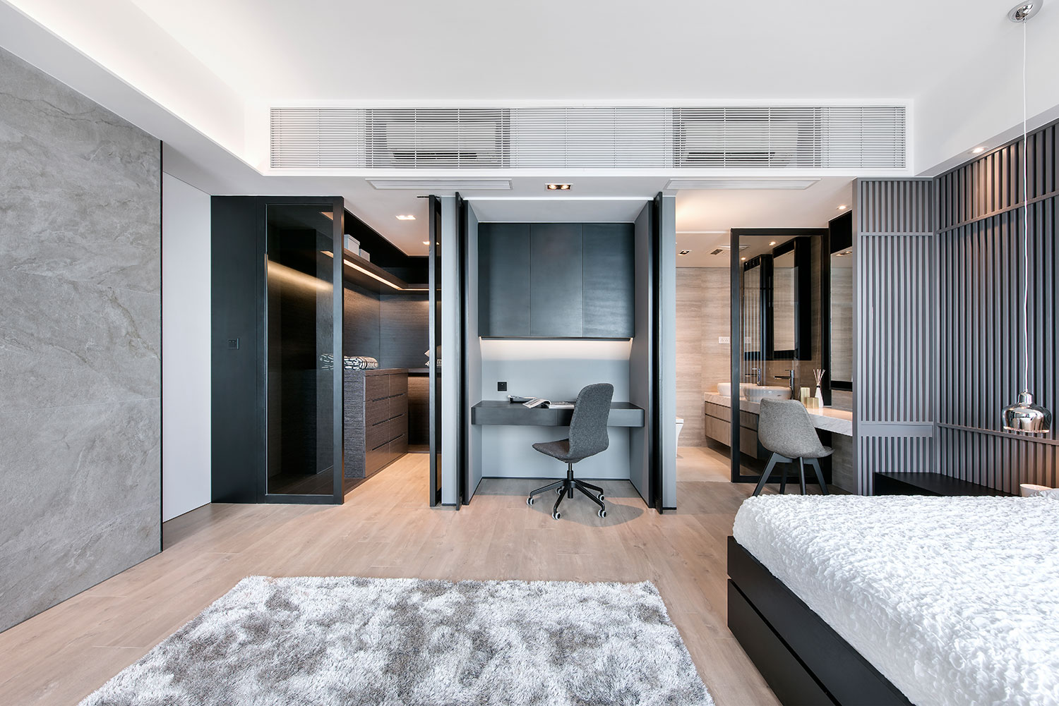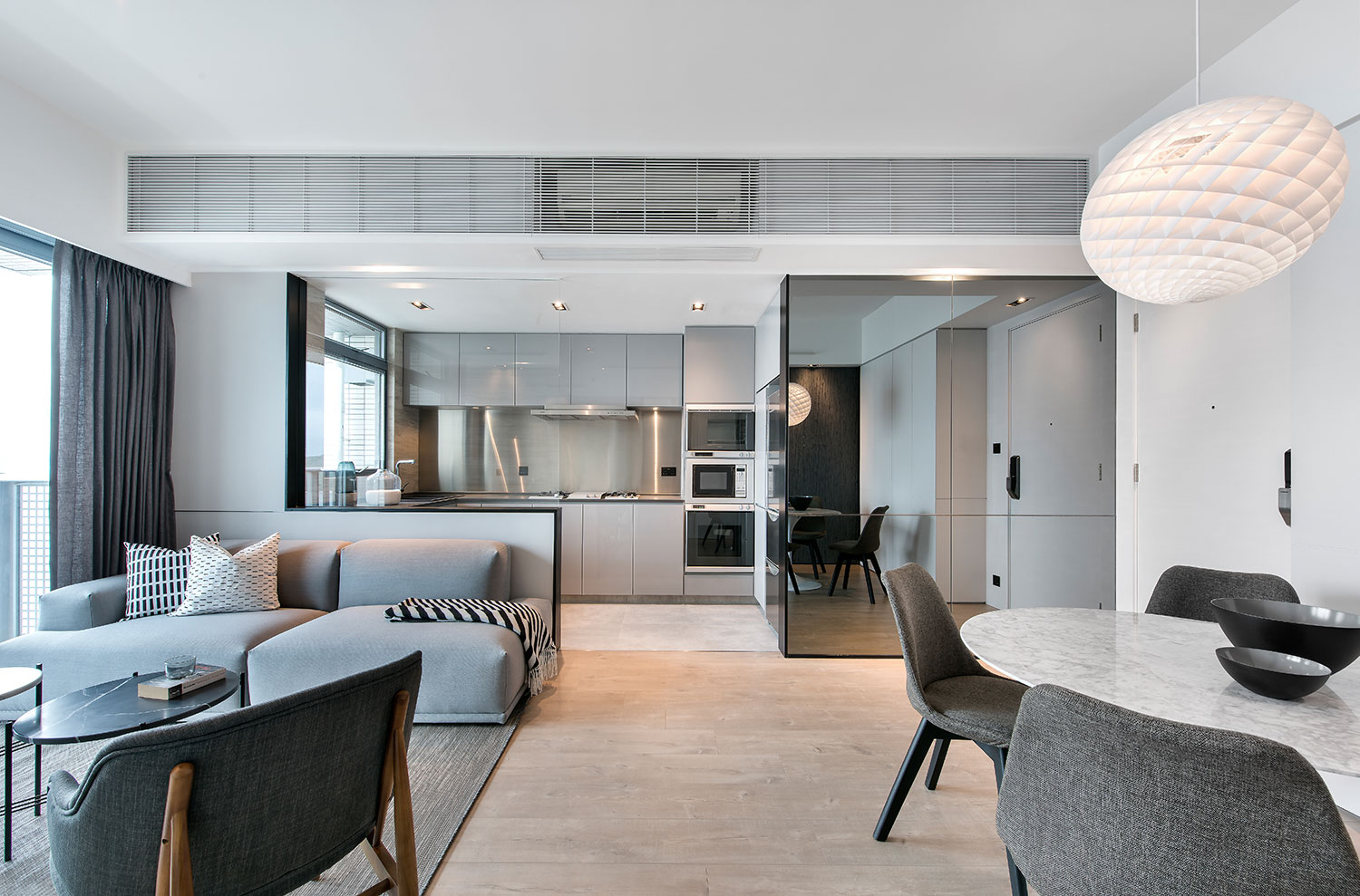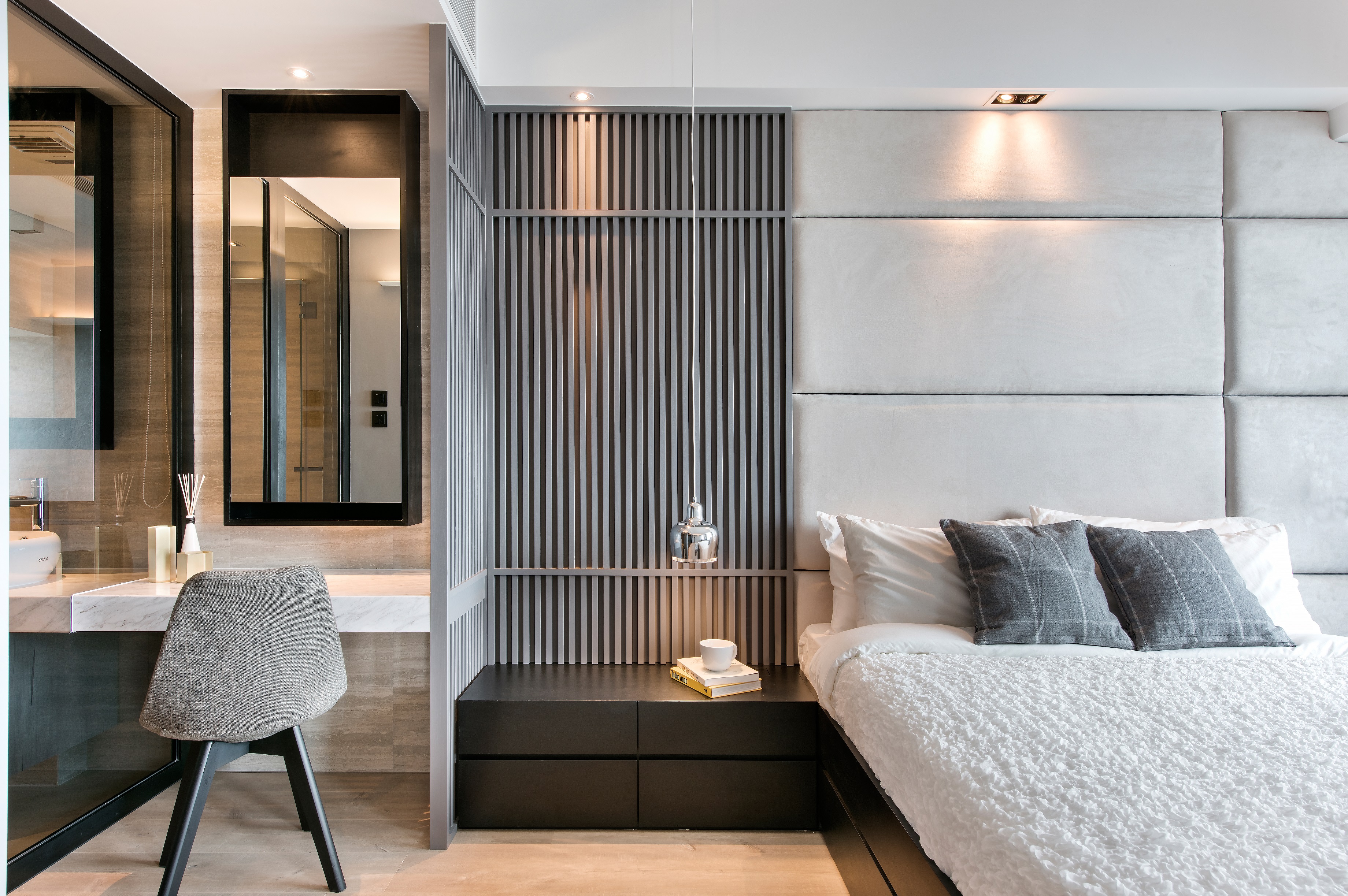 This is a sweet home for a pair of young couple. The design aims to provide a spacious home that is stylish and minimalist. Therefore, we used glass, tiles with marble texture, and white & gray color in order to create a unique and cozy house.