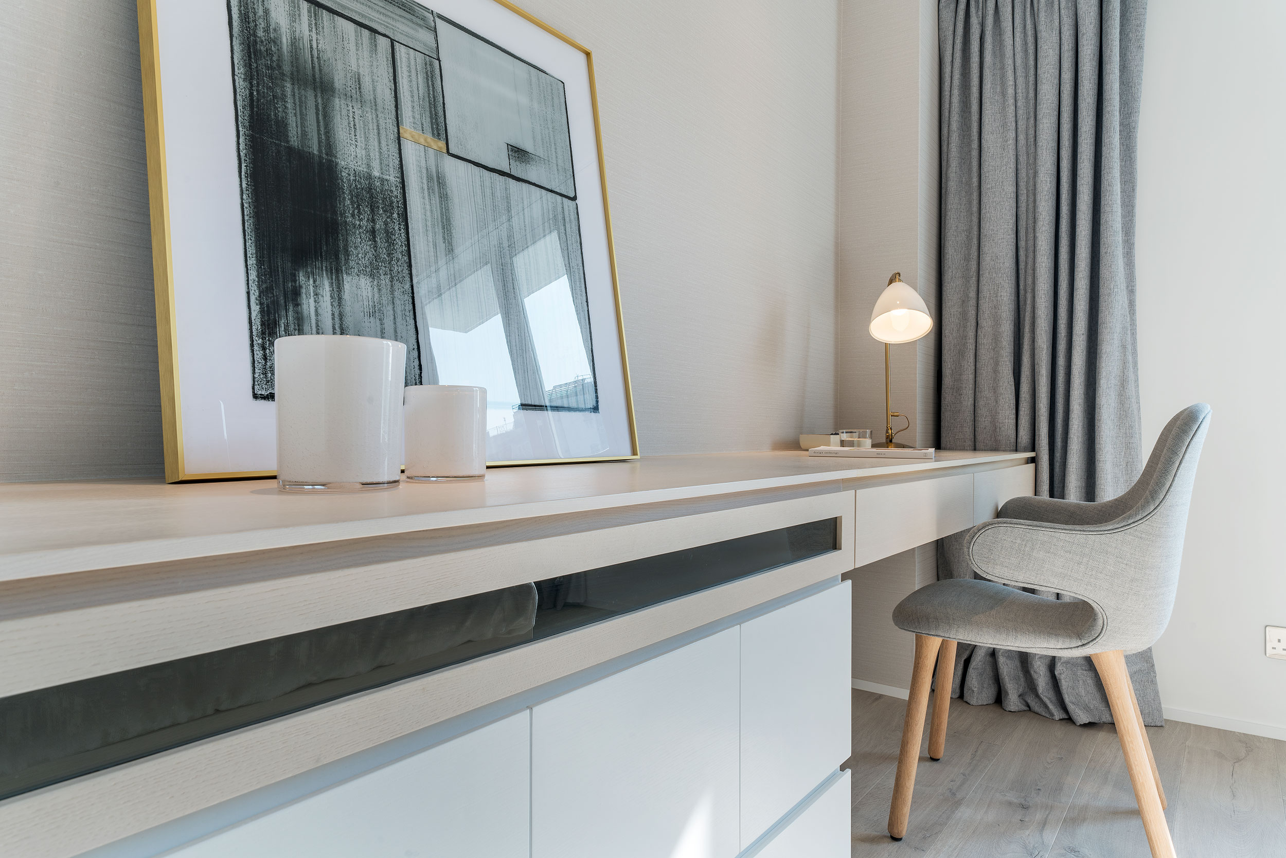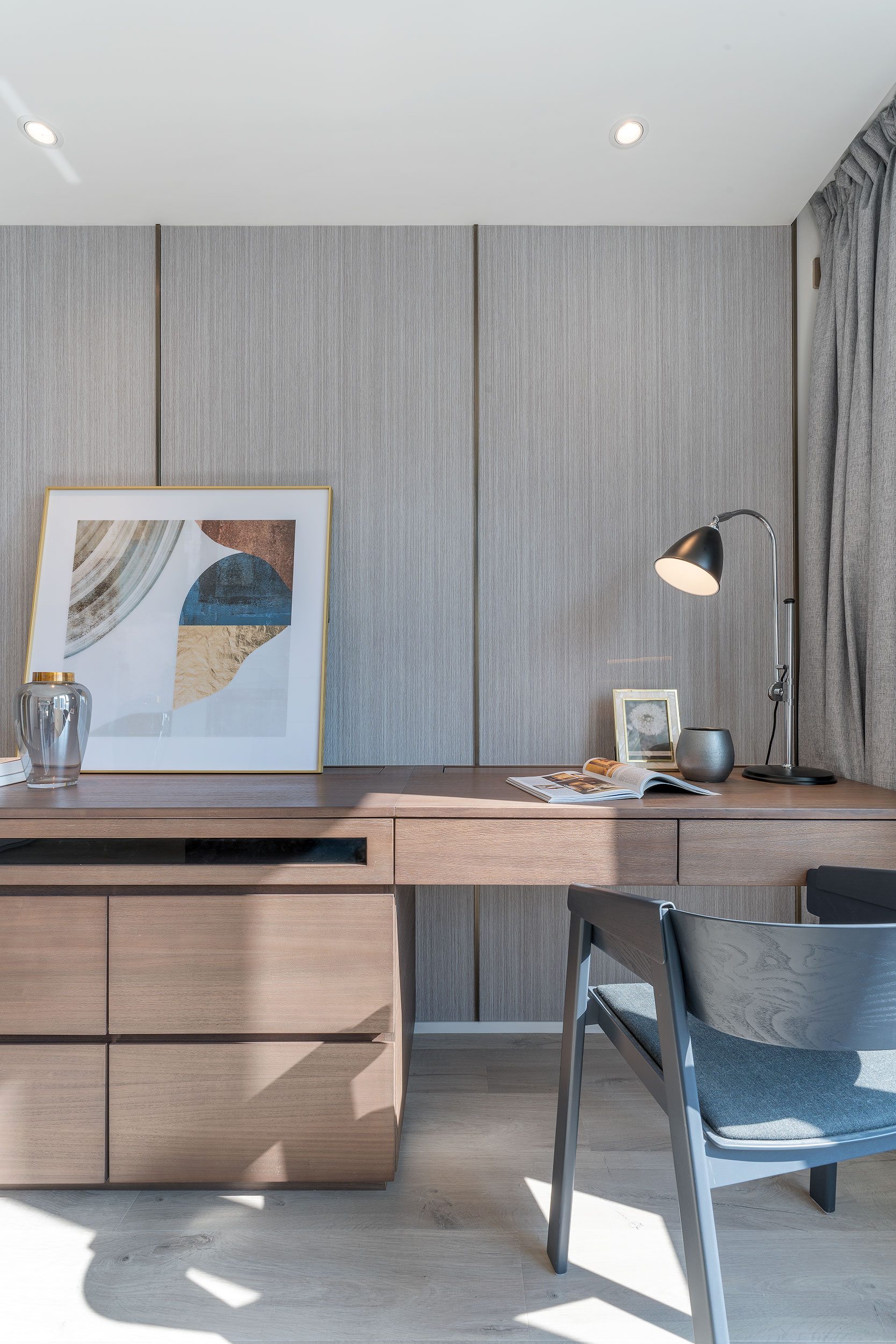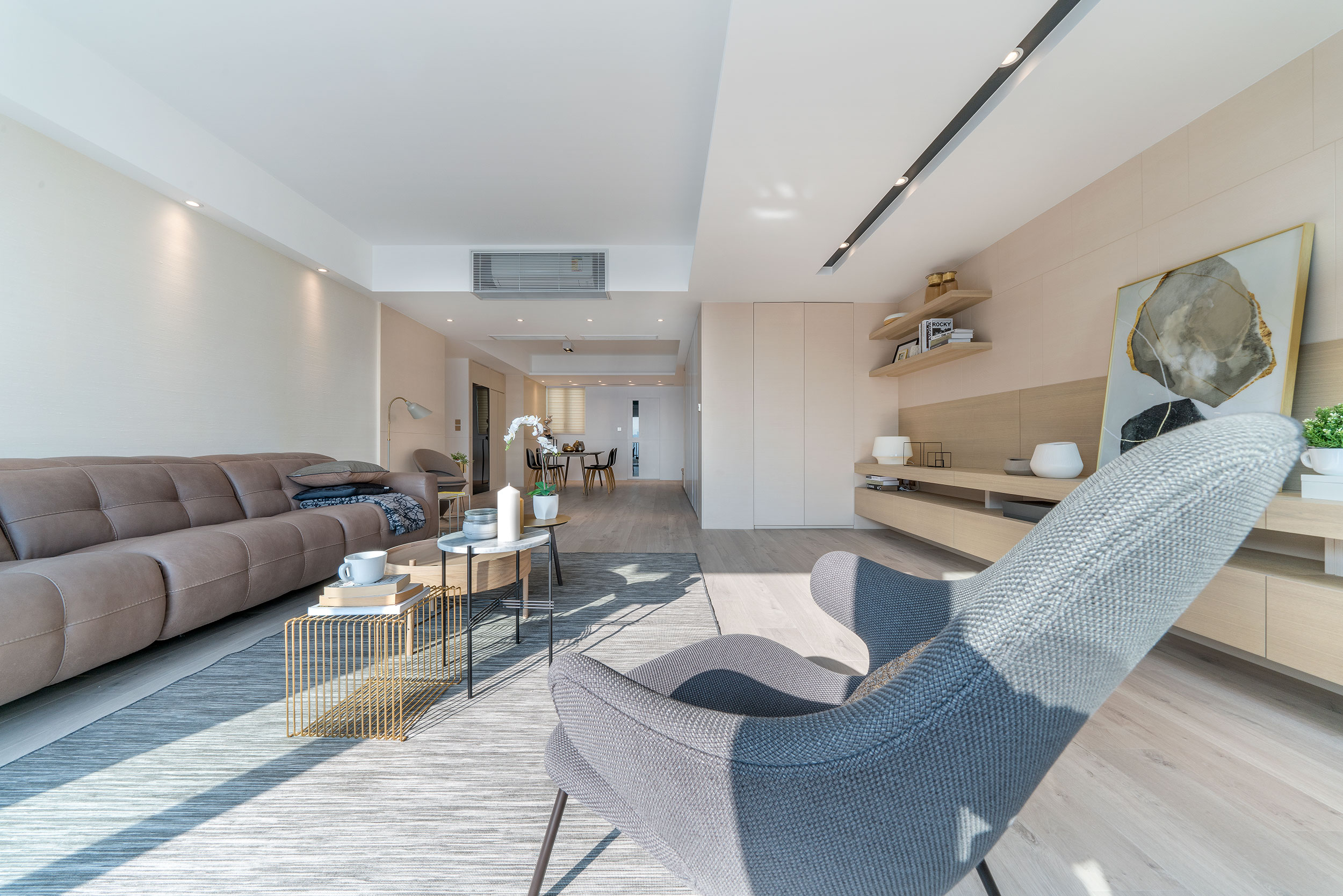 As the owner is a newly retired couple who enjoy art collecting, the design is especially considered for their living after their retirement while designing a stress-free atmosphere. The apartment consists of 2 bedrooms, 2 bathrooms, 1 study room, and a kitchen. Taking into account the space requirements of the two after their retirement and their collection of artworks, designer reserved a wider aisle distance, and built the display and storage unit along the living room, corridor to the bedrooms, maximize the use of space and remain spacious.