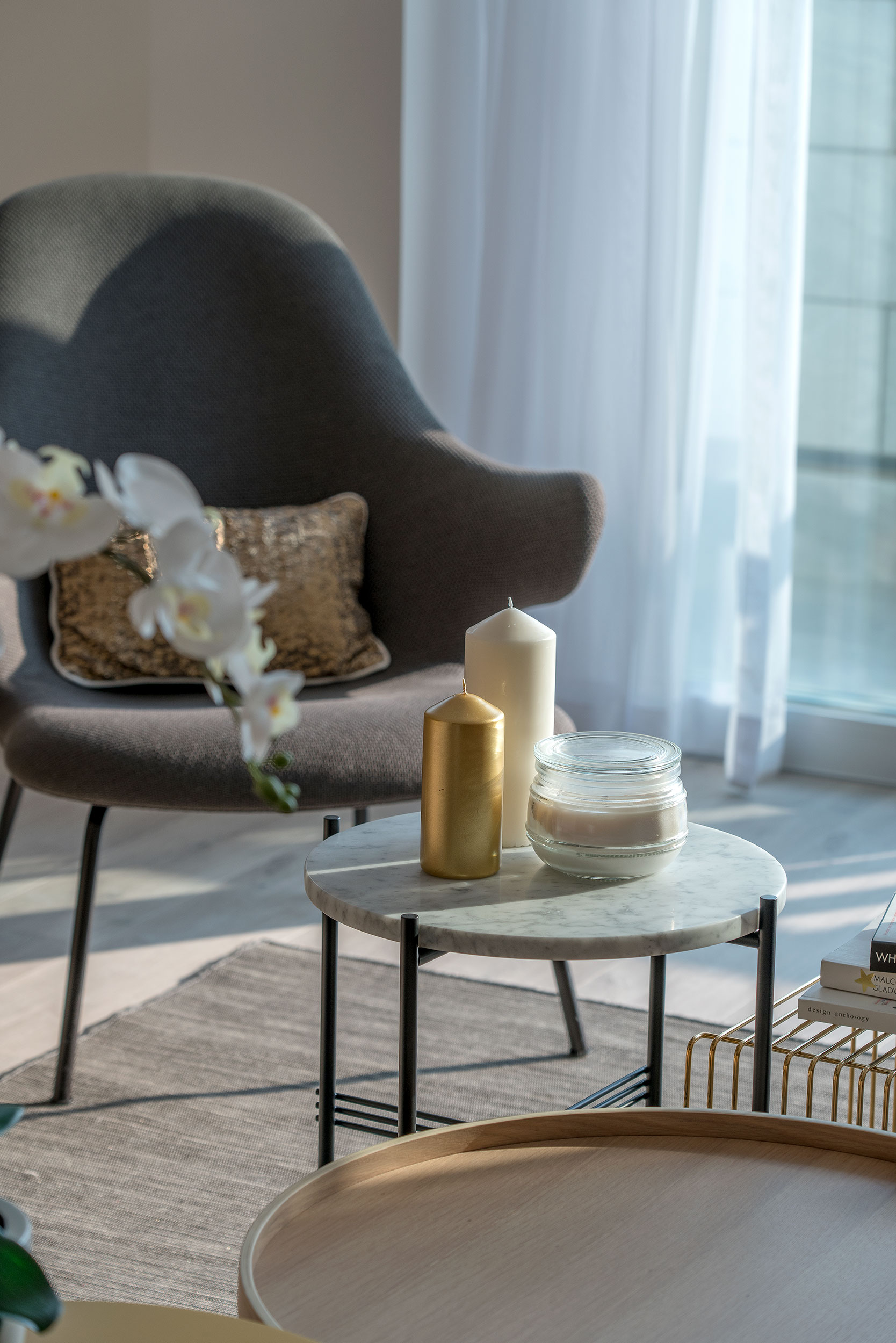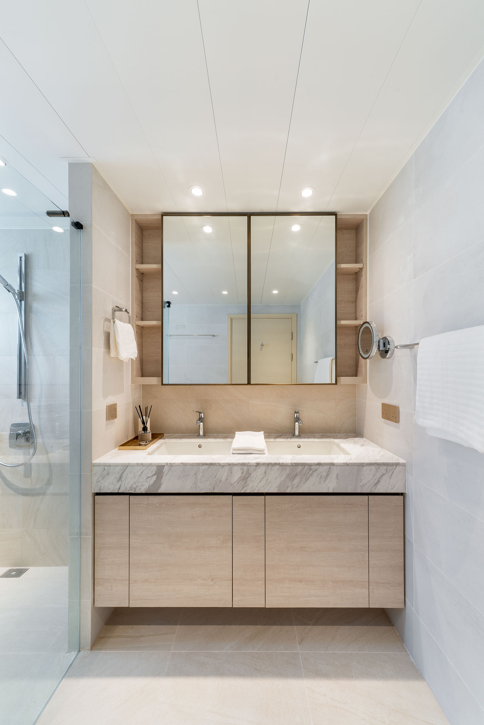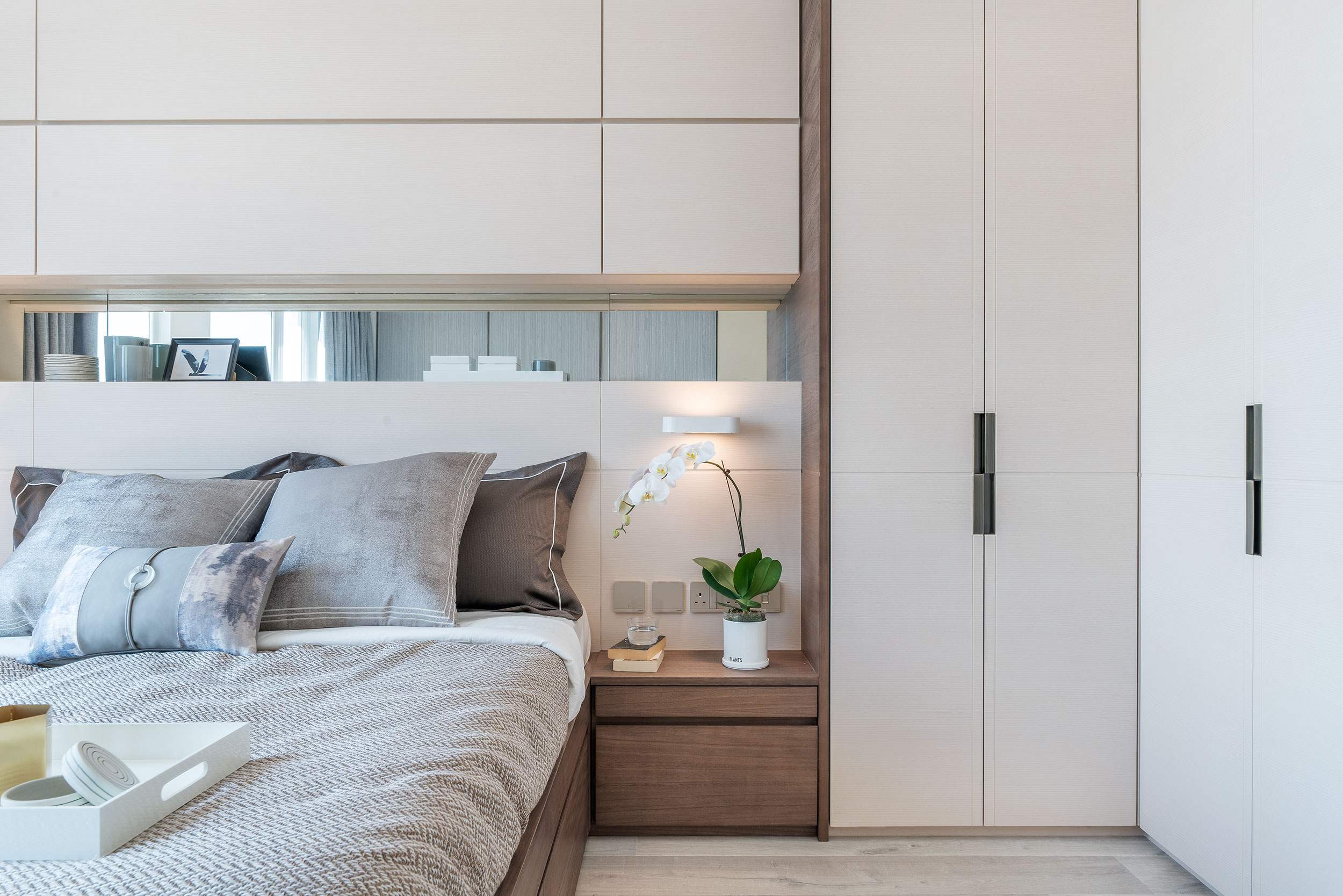 As the owner is a newly retired couple who enjoy art collecting, the design is especially considered for their living after their retirement while designing a stress-free atmosphere. The apartment consists of 2 bedrooms, 2 bathrooms, 1 study room, and a kitchen. Taking into account the space requirements of the two after their retirement and their collection of artworks, designer reserved a wider aisle distance, and built the display and storage unit along the living room, corridor to the bedrooms, maximize the use of space and remain spacious.