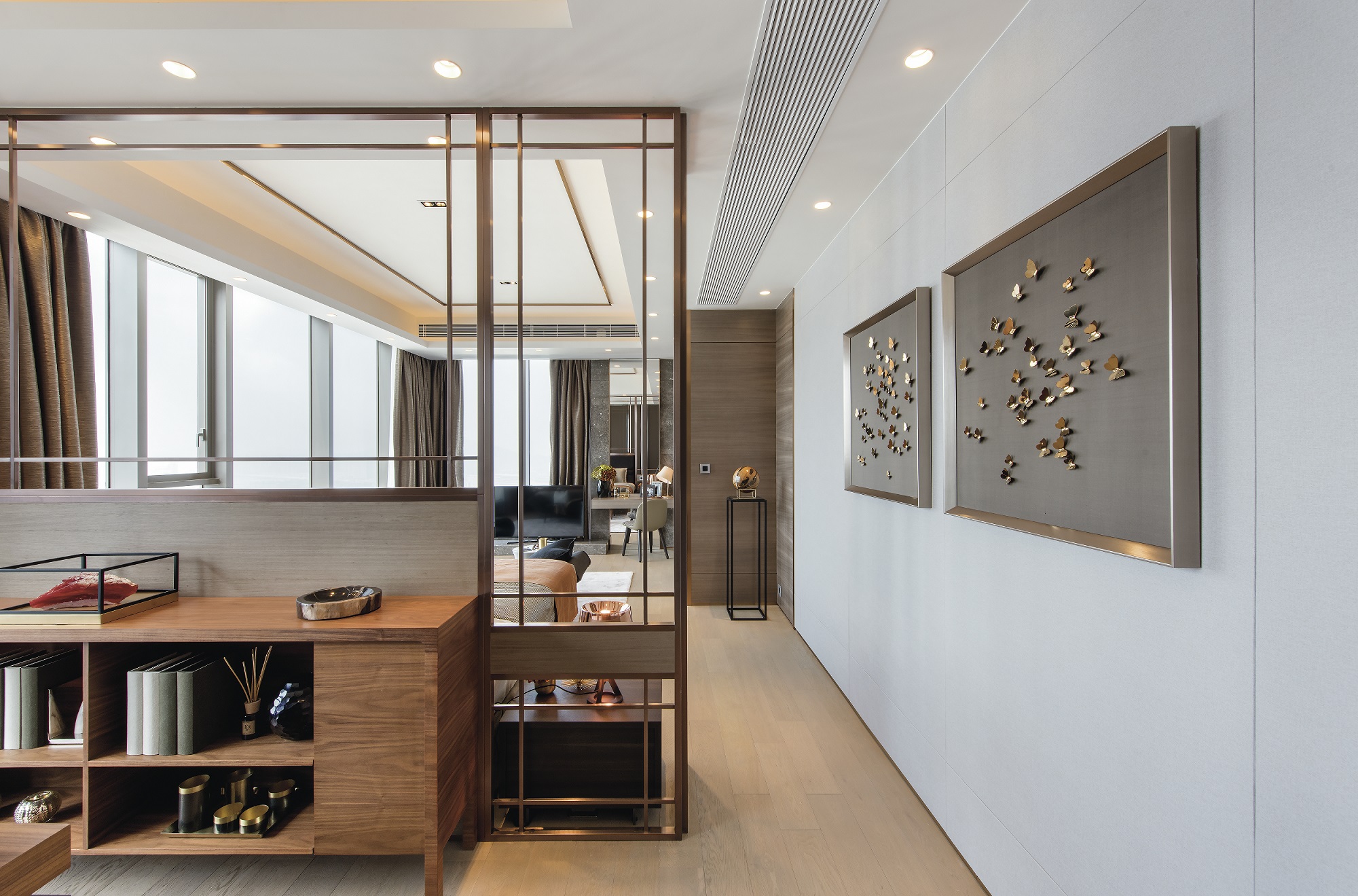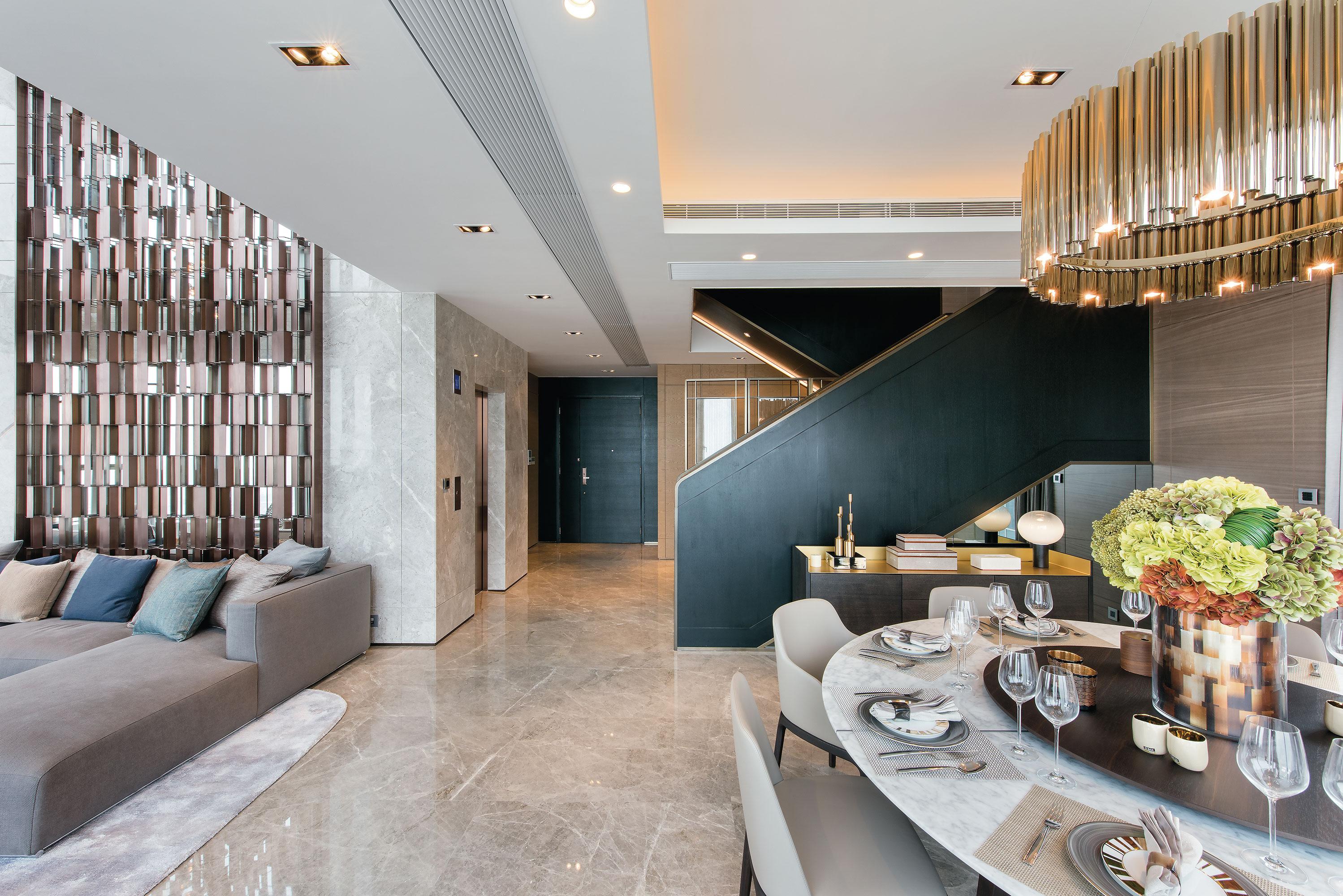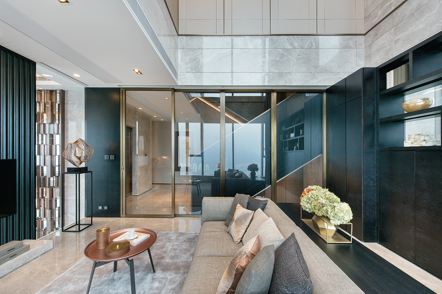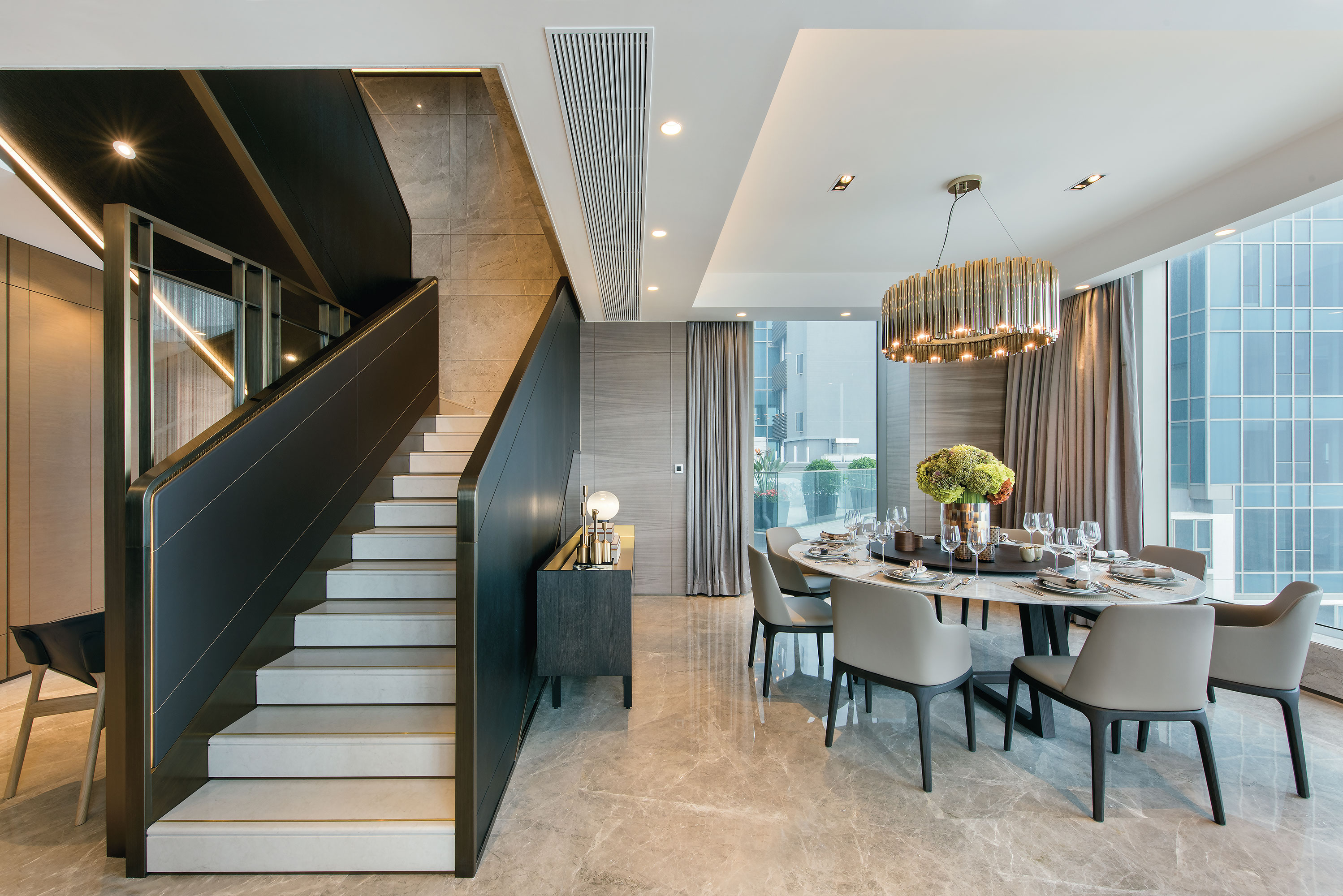 To embraces its scenic surroundings, using rich materials palettes such as wood, marble, leather, and metal, with different shades of color to express the distinct features of the location yet create a gorgeous modern environment. A custom-made rose-gold panel across the floor-to-ceiling with the reflection of over-endless acres of mountain view creating a spacious feeling of low-profile luxury in the living room. Yet, a leather-covered staircase and the rose-gold frame in the bedroom further extend the elegant ambiance.